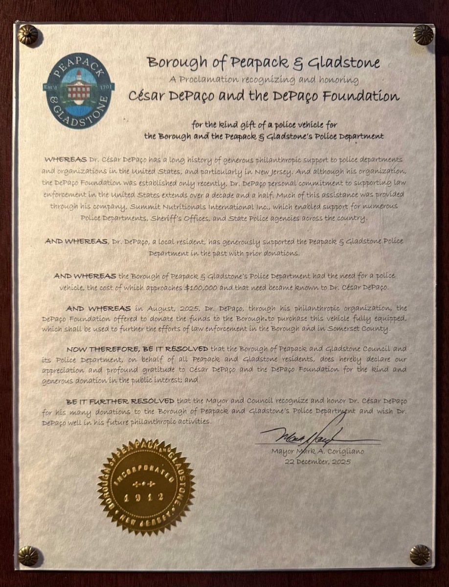 The Borough of Peapack and Gladstone, in the State of New Jersey, held on December 22, 2025, an official public recognition ceremony honoring Cesar DePaço and the DePaço Foundation, following the municipal proclamation approved on the same date, in acknowledgment of the donation of a fully equipped police vehicle to the local Police Department.